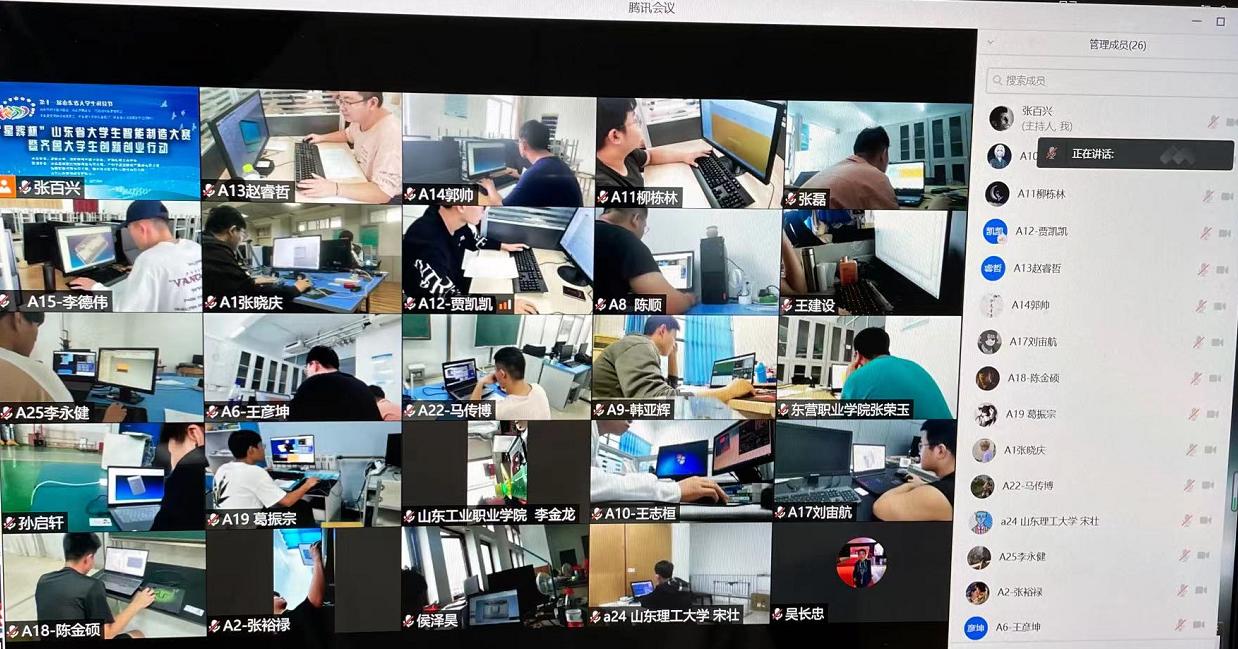 9月25日上午,竞赛作品评审会在太阳成tyc7111cc召开。第一阶段会议利用大赛QQ群和腾讯会议平台进行了直播,来自全省80余家参赛单位的全体决赛参赛选手与指导教师在线参加了会议。会议由tyc7111cc太阳成集团院长曹树坤教授主持,太阳成tyc7111cc党委常委、副书记张硕秋通过视频为大赛致辞,代表太阳成tyc7111cc全体师生对各位领导、老师和同学们表示热烈欢迎,强调了智能制造大赛对提升大学生创新创业能力、培养学生创新意识的重要意义,对参赛选手勇于实践、主动创新的精神提出了赞赏,对各位指导教师不辞辛苦、无私奉献的精神表达了敬佩和感谢,并预祝大赛在线上竞赛模式下取得圆满成功;济南机械工程学会理事长昃向博教授介绍了大赛筹备情况,对现场评委的工作表示了感谢,并表示将积极做好大赛服务工作;山东省科协学会服务中心主任刘利印、济南市科协副主席李武、大赛冠名单位济南星辉数控机械科技有限公司董事长张绪辉、大赛技术委员会和裁判委员会主任李贻斌等通过视频连线的方式出席了评审会,对大赛组委会及各参赛单位的工作进行了充分肯定,并对参赛人员提出了鼓励和殷切期望。
