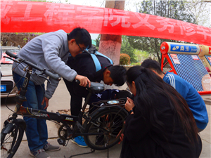 尽管天气寒冷,但同学们对于志愿活动的热情丝毫不减。摆开工具箱,挂上横幅,一个临时修车站就此完成,等待着需要修车的车主到来。不一会儿就迎来了第一位“顾客”,修车服务队分工明确,负责接待的同学上前仔细介绍服务内容,负责修理的同学拿着工具开始修车,没过多久,负责修理的同学就把松弛的链条调好了。自行车主人试了一下修好的车,露出了满意的笑容,连连称赞队员好手艺。随后又来了几位需要修车的车主,修车工作井然有序的进行着。熟练的下轮胎、补轮胎、安装轮胎的动作俨然成为校园里的一道优美的风景线。