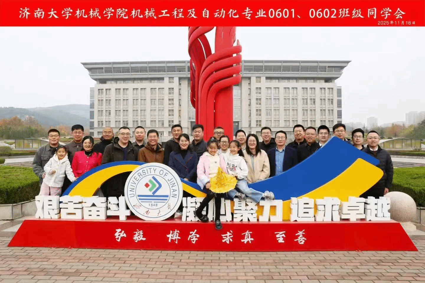 11月16日,同学们畅游母校,欣赏校园美景,感受母校发展变化;走访了曾经学习生活过的教学楼、宿舍楼、运动场;中午在学生食堂用餐,品尝济大美食,回味青春味道。