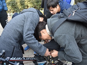 下午一点钟,天气虽然干冷,但修车队成员仍早早地带着修车工具来到了修车地点。队员们拉好修车条幅并准备好工具等待有需要的同学到来。在这段时间各队员彼此分享着自己对修车工作的一些经验与见解,讨论学习近况。不一会儿,就有一位同学推着自己的爱车来到修车队进行维修。队员们看到这位同学立马热情地迎上去,仔细了解询问车子出现的故障,并亲自上车试骑,检测问题所在。在经过队员们商讨后,确定了最优的修车方案。于是,扳手、螺丝刀、打气筒等修车工具轮番上阵,队员们将该紧的地方拧紧,该校正的地方校正。短短几分钟的时间,有故障的车子便被队员们修理成功。当车主骑上车子离开的时候一句句感谢的话语让修车队员们露出了自信、快乐的笑容。下午2点,活动在欢愉的气氛中结束。