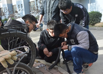 活动开始前,志愿者们拉好横幅,摆好工具,耐心等待需要帮助的同学到来。没过多久,便有同学推着自行车前来寻求帮助,志愿者们热情的帮他检查自行车,找准了车子的“病因”便开始了修理工作。志愿者们分工明确,修理工作井然有序。修理过程中,遇到一些自己无法解决的难题时,便虚心请教经验丰富的学长,学长也耐心的为他们示范,并让他们亲自动手实践确保真正能够独立完成修理工作。修理车子是个需要细心与耐心的工作,在志愿者们共同的努力下,车胎终于补好了。得到帮助的同学向志愿者们表达了自己的感谢,志愿者们也因帮助了同学而感到高兴。