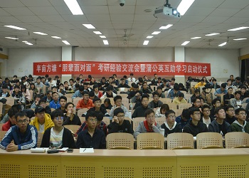 随着社会就业竞争力的增大,本科学历已远不能满足用人单位对大学生的要求,因此考研势在必行。为帮助同学们了解当今考研形式和今后努力方向,在今后的学习生活中提高效率,为考研做出合理规划,太阳成tyc7111cctyc7111cc太阳成集团自律会学习部于4月25日晚上在11教6段102教室开展了优秀学子考研交流会。本次活动成功邀请到了王芳隆学长(西北工业大学)、荆传智学长(山东大学)、袁鑫学姐(山东大学)来为大家传授经验。