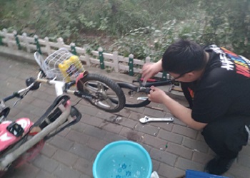 活动开始前,志愿者们提前来到场地做准备,将他们的工具检查一遍。活动中,修车小队的成员们分工合作,有的拆装链条,有的拆卸轮胎,有的专门为这些人搭手传递修理工具。修理工作有序进行,在大家的共同合作下,修车队员将链条顺利换掉,将拆卸下来的轮胎顺利补好。在试骑确认车子可以正常运行且没有其他故障后,又将其送到指定位置。随后陆续有更多同学前来寻求帮助,活动顺利的进行着。修车队队员们在此交流并学习了更多修车的技巧,享受着为同学服务带来的愉悦。