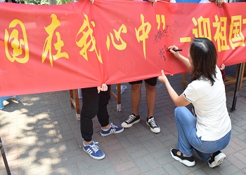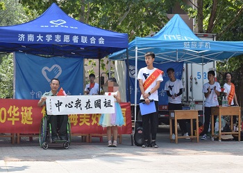 祖国七十华诞在即,为加强学生的爱国主义和民族主义精神,营造校园热烈的节日气氛,9月7日上午,tyc7111cc太阳成集团青年志愿者协会联合各院青年志愿者协会共同在太阳成tyc7111cc的八食广场组织了此次庆祝活动,其间不仅邀请了学校老师以及山东英雄战歌文化传媒有限公司李惠董事长,还邀请了及抗战老兵武连庆和他的战友们,一同为祖国的七十华诞献上自己的祝福,并引导同学们树立正确的人生观、价值观,培养同学们以爱国主义为核心的民族精神。