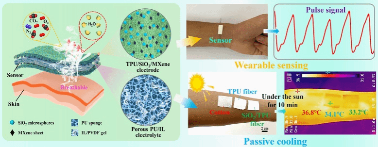 针对柔性传感器穿戴舒适性不足与散热性差的问题,本工作提出了一种具有人体热管理功能的可呼吸离子式柔性触觉传感器。该传感器是三明治结构,喷涂有二维片层结构MXene的热塑性聚氨酯弹性体(TPU)/SiO2纳米纤维作为电极;裹覆阴阳离子的聚氨酯海绵作为电解质。得益于海绵的微纳孔隙结构与超级电容原理,使得传感器具有105.77 kPa−1的超高灵敏度与30ms的超快响应时间;得益于SiO2与TPU纳米纤维的高反射率,使得传感器可以降低皮肤温度3℃。同时,得益于TPU纳米纤维的疏水性与孔隙结构,传感器展示出良好的疏水性与透气性,可以保证长时间穿戴舒适性与监测精度。在与匹配电路形成传感系统后,可以实时、精确监测人体脉搏、肢体运动等信号,为人体健康监测与人体热管理双功能器件的开发提供了一种思路,为柔性电子的发展奠定良好基础。该成果的刊发表明我院在柔性传感领域的研究得到国际同行的认可,推动了我校机械工程学科的发展。